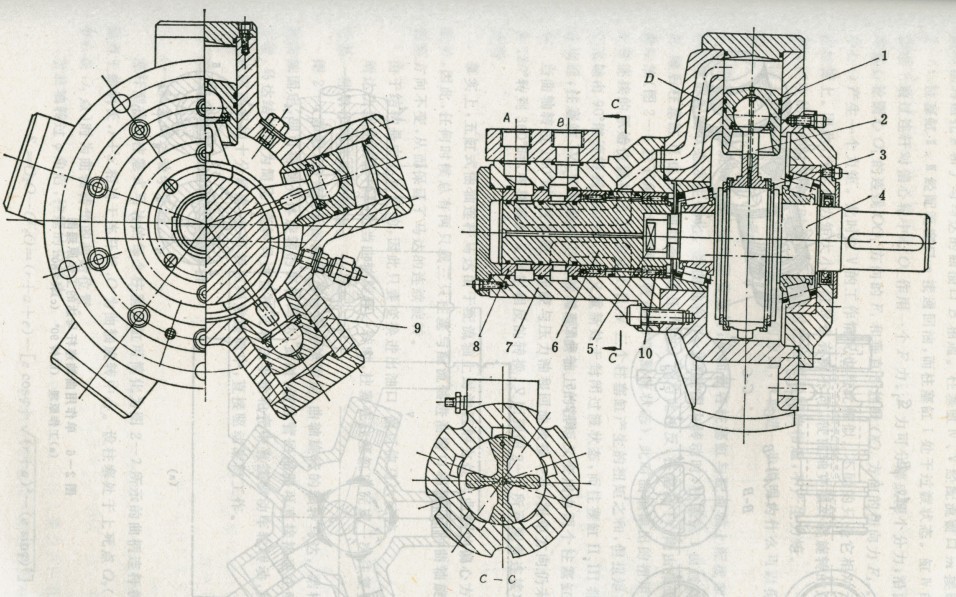 該馬達由柱塞、連桿、曲軸、星形殼體以及配流軸等組成。馬達的星形殼體9中按徑向在圓周均勻分布有五個柱塞缸,每個柱塞缸孔內(nèi)裝有柱塞1。在柱塞的中心球窩內(nèi)裝有連桿2小端的球頭,連桿大端的凹形圓柱面緊貼于曲軸4偏心圓上,并通過兩只壓環(huán)3壓住連桿2,以防止與偏心圓脫離。曲軸4通過一對圓錐滾子軸承支承在前蓋和殼體上。曲軸的外伸端為馬達的輸出軸。曲軸的另一端通過十字滑塊聯(lián)軸器5帶動配流軸6旋轉(zhuǎn)。這樣可避免加工和裝配誤差不同心而發(fā)生的卡死現(xiàn)象。