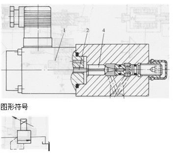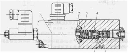 1-比例電磁鐵2-推桿3-彈簧4-錐閥