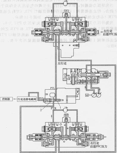 ③行走連接閥的功能(圖)。該閥使兩個(gè)行走油路彼此連接以使液壓油平均分配到兩個(gè)行走馬達(dá),機(jī)器將直線行走。機(jī)器轉(zhuǎn)向時(shí),外側(cè)先導(dǎo)壓力PST關(guān)閉行走連接閥以確保高轉(zhuǎn)向性能。