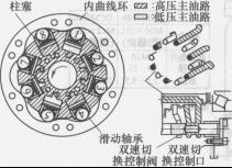 當馬達上雙速切換控制口壓力為0. 2MPa或更低時,壓力油與配油軸上的六個配油口相通(全排量工作模式);當馬達上雙速切換控制口壓力為1.O~4. 9MPa時,壓力油只與配油軸上的三個配油口相通(半排量工作模式)。