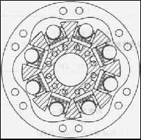 如圖所示,馬達旋轉缸體帶8個柱塞,內曲線環(huán)由6個作用段組成。馬達柱塞上滾輪受來自于泵的壓力油作用,沿定子內曲線環(huán)運動進而完成馬達吸/排油,實現(xiàn)泵側的輸出液壓能轉換為馬達側的輸出轉矩。