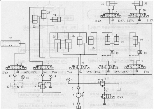 1-過濾器;2-定量液壓泵13、1 6、17-單向閥;4、14、15壓力表;5先導(dǎo)式溢流閥;6-二位二通電磁換向閥;7、8、9,10、11、20、21三位四通電磁按向閥;12、13-減壓閥;18、19-渡控單向閥;22左堵孔液壓缸; 23一右堵孔液壓缸;24一前端堵孔液壓缸;25-夾緊液壓缸;26-下端堵孔液壓缸;27-轉(zhuǎn)位液壓缸;28、29-舉升液壓缸;30-抓舉液壓缸;30-接件液壓缸;31-限位液壓缸;32-堵凸輪軸徑孔