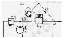 圖3. 4-18中插裝閥K液阻橋路在L1、L2形成減壓回路。在此回路中插裝閥K為常開式。L2點(diǎn)的壓力為減壓后的壓力,此壓力由先導(dǎo)溢流閥Dp調(diào)定。先導(dǎo)液阻R為插裝閥K閥心的連續(xù)變化提供條件。