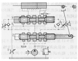 圖9-14所示為一種比較簡(jiǎn)單的時(shí)間控制制動(dòng)式換向回路。這個(gè)回路中的主油路只受換向閥3控制。在換向過程中,例如,當(dāng)圖中先導(dǎo)閥2在左端位置時(shí),控制油路中的壓力油經(jīng)單向閥I2通向換向閥3右Jl端,換向閥左端的油經(jīng)節(jié)流閥J,流回油箱,換向閥閥心向左移動(dòng),閥心上的錐面逐漸關(guān)小回油通道,活塞速度逐漸減慢,并在換向閥3的閥心移過Z距離后將通道閉死,使活塞停止運(yùn)動(dòng)。當(dāng)節(jié)流閥Jl和J2的開口大小調(diào)定之后,換向閥閥心移過距離Z所需的時(shí)間(使活塞制動(dòng)所經(jīng)歷的時(shí)間)就確定不變,因此,這種制動(dòng)方式被 稱為時(shí)間控制制動(dòng)式。