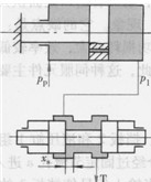圖6-40a為單邊滑閥控制式,它有一個(gè)控制邊。活塞上的阻尼孑L使液壓缸左右兩腔相通。控制邊的開口量x??刂屏烁字杏鸵旱膲毫土髁?,從而改變了缸的運(yùn)動(dòng)速度和方向。