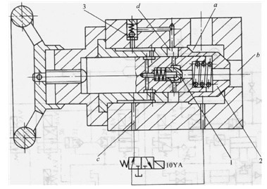 基于壓鑄成型下藝的特殊要求,壓射部分液壓管路的設(shè)計流速,一般可取25~30m/s,否則液壓管路和元件將變得十分龐大,使整個壓射機構(gòu)難于安排。蓄能器按絕熱狀態(tài)計算。方向閥要滿足快速啟動和大流量的要求。第一級快速壓射閥34是普通插裝閥,第一級快速壓射閥是一種特殊結(jié)構(gòu)的插裝閥,它允許通過的壓力油的流量不低于4200L/min,具有快速啟動和自動關(guān)閉的性能,不需要大的先導(dǎo)閥控制,其結(jié)構(gòu)簡圖見圖3。閥的a腔與壓射蓄能器22和31相通,b腔接壓射缸的無桿腔,當(dāng)先導(dǎo)電磁閥10YA動作時,c腔回油并向閥l左腔回油,其閥芯打開,d腔中的油流進b腔。于是主閥芯2左移,使a腔接通,進行快速壓射??靿荷浣Y(jié)束時,10YA斷電,壓力油進入c腔,一路關(guān)閉單向閥,另一路經(jīng)單向閥3進入d腔關(guān)閉主閥芯2。