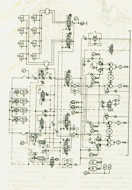 插銷(xiāo)缸29、28由中壓泵3供油,經(jīng)閥18左位、12、11至液壓缸29、28。液壓缸30的上下運(yùn)動(dòng)和液壓缸29、28的鎖放動(dòng)作的協(xié)調(diào)配合,是借助電氣程序回路控制電液換向閥18、13、12、11來(lái)實(shí)現(xiàn)的。