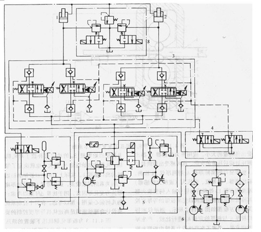 圖 3為板帶軋鋼機(jī)壓下裝置的液壓系統(tǒng)圖。圖中1、2分別為軋機(jī)前后兩側(cè)的壓下液壓缸。液壓缸無杠腔靠伺服單元3控制。每個壓下液壓缸由兩個并聯(lián)電液伺服蒯采用下述方式進(jìn)行控制:在一個電液伺服閥的控制電路中加入△%的死區(qū);另一則無死區(qū),這樣,當(dāng)控制信號小于死區(qū)范圍時只有一臺伺服閥工作,系統(tǒng)的增益較小容易穩(wěn)定;當(dāng)控制信號大于死區(qū)范圍時兩臺伺服閥同時工作,系統(tǒng)增益較大有利于快速調(diào)節(jié)。轉(zhuǎn)換油路單元4可對四個電液伺服閥前后的八個液控單向閥進(jìn)行操縱,可使電液伺服閥從系統(tǒng)中切除或投入。電液伺服閥由高壓油源單元5供油,單元中的蓄能器用以減少供油壓力的波動。高壓油源單元在正常工作情況下由低壓油源單元6供油,在單元中有精過濾器。由于高壓液壓泵吸入的是加壓后的精濾油,這樣就提高了工作可靠性和壽命。壓下液壓缸有桿腔是由回程油路單元7供油,正常工作時Ff低壓油路單元6直接供油,軋機(jī)的輥縫開啟時經(jīng)減壓后供給較高壓力的液壓油。8為保護(hù)單元,對壓下液壓缸的有桿腔和無桿腔進(jìn)行過載保護(hù)。