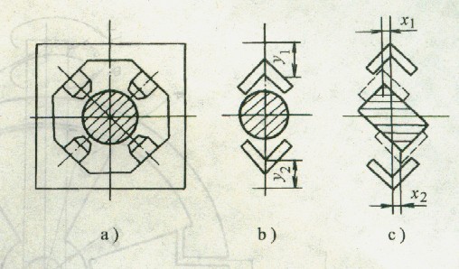 對(duì)棒狀或管狀鋼坯料進(jìn)行冷熱加工時(shí),往往需將其送人并保持在某一幾何中心上。例如對(duì)圓形斷面的棒料進(jìn)行多方向的鍛打時(shí),工件必須保持在鍛打中心Ce上,如圖1a所示,這就需要采用定心夾鉗。如采用普通機(jī)械式夾鉗,使上、下鉗口閉合量y1、y2相等,如圖中b所示,雖然可以達(dá)到定心的目的,但當(dāng)工件沿軸向移動(dòng),而且工件的外形發(fā)生變化時(shí),可能產(chǎn)生偏心或卡死。如采用普通液壓傳動(dòng)裝置,分別對(duì)上、下鉗口的閉合量進(jìn)行控制。在工件外形尺寸變化時(shí),就需要隨時(shí)進(jìn)行調(diào)整,且不易達(dá)到自動(dòng)定心。特別是在被夾持的工件為矩形斷面時(shí),如圖中c所示,一個(gè)自由度閉合量的夾鉗就無法使工件定心。