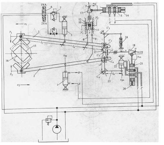 夾鉗夾持矩形斷面工件時(shí),不僅y方向自由度的機(jī)液伺服系統(tǒng)參加工作,x方向自由度的機(jī)液伺服系統(tǒng)也同時(shí)參加工作,以保證矩形斷面工件自動(dòng)定心。當(dāng)上鉗口自重下落到矩形斷面工件表面時(shí),要產(chǎn)生向左方向的位移量x1,直到鉗口與工件表面相吻合為止,如圖中16所示。由液壓缸22,機(jī)液伺服閥21,錐體18,比較器17組成的x方向的機(jī)液伺服控制系統(tǒng)能保證下鉗口2產(chǎn)生與上鉗口位移x1方向相反的同步位移x2。出于x、y兩個(gè)自由度機(jī)液伺服系統(tǒng)的同時(shí)工作,矩形斷面工件不僅可沿軸向移動(dòng),而且能隨時(shí)自動(dòng)保持定心。
