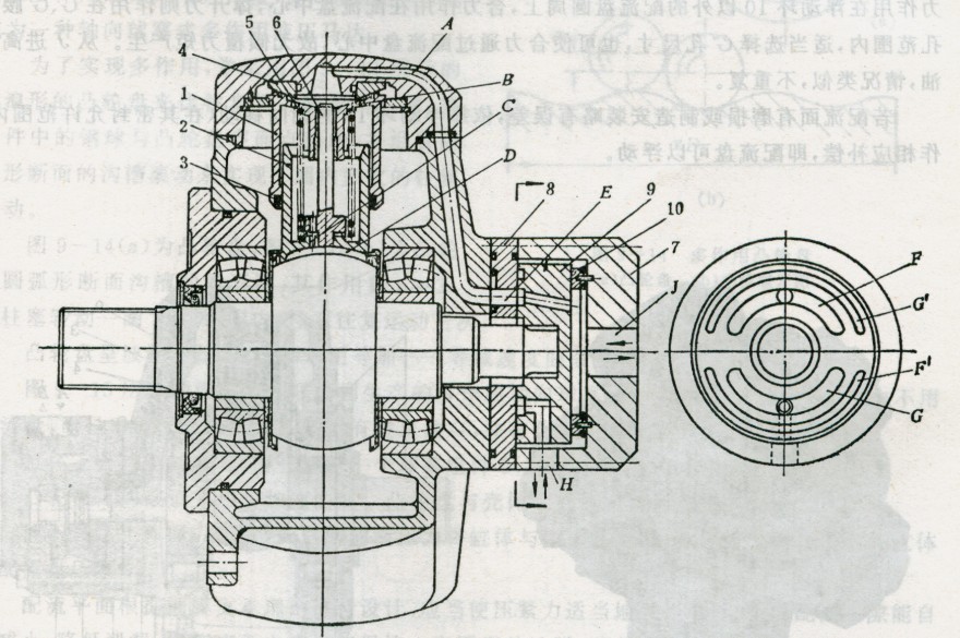 此配流裝置的主要.特點(diǎn)是:配流盤不傾覆,可以浮動(dòng)。為防止配流盤的傾覆,設(shè)有兩條輔助腰形孔F’、G’,相應(yīng)地與F、G孔相通(圖9 -12中未表示)。若高壓油從孔H進(jìn)入,則液壓壓緊力作用在浮動(dòng)環(huán)10以外的配流盤圓周上,合力作用在配流盤中心,撐開(kāi)力則作用在G、G’腰形孔范圍內(nèi),適當(dāng)選擇G’孔尺寸,也可使合力通過(guò)配流盤中心,故無(wú)傾覆力矩產(chǎn)生。從J進(jìn)高壓油,情況類似,不重復(fù)。