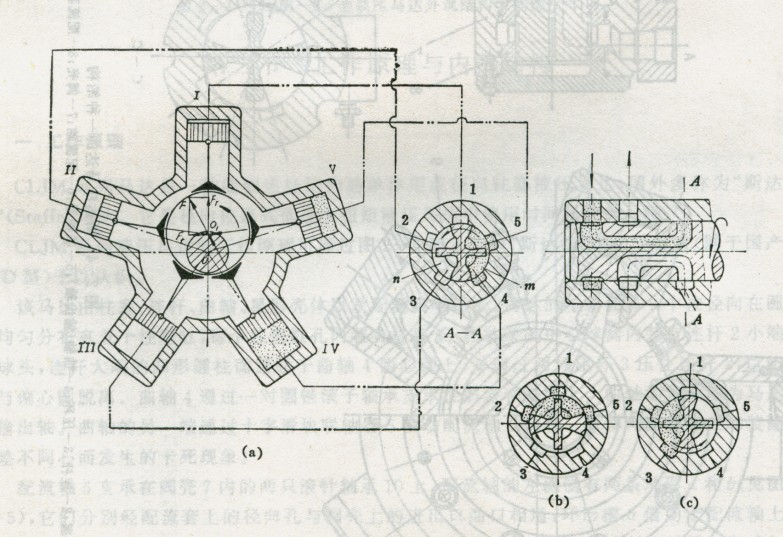 與傳統(tǒng)斯達(dá)法型馬達(dá)外形基本相同。其馬達(dá)的星形殼體4上有徑向布置的五個柱塞缸孔,每個缸孔中裝配一個活塞16,每個活塞16的球窩中部均鉸接著連桿17的球頭,球頭內(nèi)端的對開式球頭座18,被卡在活塞槽孔內(nèi)的孔用彈簧擋圈19軸向定位,連桿大頭端的凹形圓弧面剛好與曲軸的曲軸頸吻合,五只連桿大端在曲軸頸的兩側(cè)分別各用一只抱環(huán)5箍牢,使得各缸連桿在回程工作時不與曲軸頸脫離。