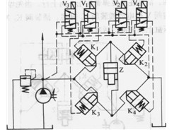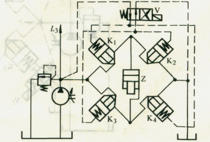 圖3.4-8中往復(fù)運動活塞液壓缸Z運動的主油路是由四個插裝閥K1、K2、K3、K4所組成的液阻橋路進行控制的。當(dāng)先導(dǎo)兩位四通電磁換向閥V得電后插裝閥K2、K3關(guān)閉,K1、K4開啟,液壓缸Z的活塞下行。當(dāng)先導(dǎo)兩位四通電磁換向閥V失電后,插裝閥K2、K3開啟,K1、K4關(guān)閉,液壓缸Z的活塞上行。