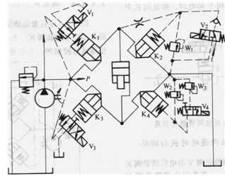 圖3 .4-9中液壓缸Z的往復(fù)運動、封閉及各種中位功能,由主油路四個插裝閥Ki、K2、K3、K4所組成的液阻橋路進行控制的。每個插裝閥分別由相應(yīng)的四個兩位三通先導(dǎo)電磁換向閥Vl、V2、V3、V4分別控制。四個先導(dǎo)電磁換向閥的得電與失電的不同組合可獲得十二位四通換向功能。例如中位時K.、K3關(guān)閉,K2、K4開啟,中位機能為
