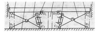 由圖4中可以看出,樂池升降臺的升降臺板1的四周均有導(dǎo)向用的導(dǎo)向墻,而實際中升降臺板四周和導(dǎo)向墻之間的距離一般為20 - 30mm,由于鋼架及升降臺板重量在長度方向的水均勻性和左右鋼架動作時摩擦力等方面的差異,會造成了兩只活寨桿上承受的載荷不問。此外,當(dāng)左、中、右支承塊高度不樣,造成在初始位置時升降臺板已不在水平位置上。上進(jìn)所有情況,均有可能導(dǎo)致樂池升降臺板運動時的傾斜。越往復(fù)運動,高度方向上的累計誤差越大,傾斜就越厲害。