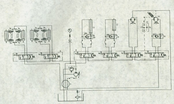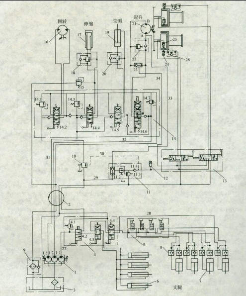 QY20B型起重機的液壓控制系統(tǒng)主要由支腿回路、回轉(zhuǎn)回路、支臂控制回路和吊起控制回路組成。圖4.17-9所示為QY20B型汽車起重機1的液壓系統(tǒng)原理圖。