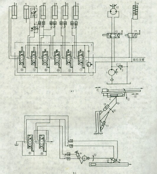 所謂雙機鑿巖臺車是指一個臺午上裝備有兩個鑿巖支臂。在掘進(jìn)工程中要求鑿巖臺車能夠鉆鑿平行炮眼、傾斜炮眼和周邊炮眼。因此要求支臂能夠進(jìn)行如下動作:(參照圖b)①支臂的變幅動作;②支臂的水平擺動;③推進(jìn)器的仰俯動作;④推進(jìn)器的水平擺動;⑤推進(jìn)器的補償動作和⑥推進(jìn)器的推進(jìn)動作。