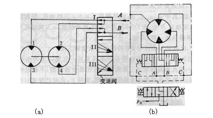 若馬達(dá)的陸面數(shù)為z,將曲面數(shù)為z的導(dǎo)軌分成兩組或多組,實(shí)際上相當(dāng)于將一個(gè)馬達(dá)分成同軸的幾個(gè)馬達(dá)的并聯(lián)組合。用變速換向閥及設(shè)計(jì)成與此相適的配流軸的特殊結(jié)構(gòu)完成變量。變速換向閥可以置于配流軸外的系統(tǒng)管路中,也可以裝在配流軸內(nèi),此時(shí)結(jié)構(gòu)更為緊湊。