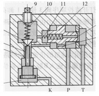 這種回路中卸荷閥的結構是專門設計的(見圖9-llb),它與一般先導式壓力閥不同。其導閥8除了受彈簧10的力和b腔處液壓力作用外,還要承受柱塞7的推力。當蓄能器開始充油時,卸荷閥中的導閥8和主閥12都處于關閉位置,油腔a和b處的壓力都等于泵壓,柱塞兩端液壓力平衡,對導閥不產(chǎn)生推力。隨著進入蓄能器油液的不斷增多,油腔a和b中的壓力亦不斷升高;當壓力升高到b腔的液壓力能克服導閥彈簧力,將導閥打開時,P口處來的壓力油便經(jīng)阻尼孔14、導閥閥口、主閥中心孔13和通口T流回油箱。由于阻尼孔的作用,b腔壓力小于泵壓,這使主閥閥口打開,泵開始卸荷。此時b腔壓力小于a腔壓力。柱塞便對導閥施加一額外的推力,促使導閥和主閥的閥口都開得更大,結果使b腔壓力下降到零,柱塞處于其最上端位置。由于a腔的工作面積比b腔大,因此蓄能器中的壓力即使因泄漏而有所下降,卸荷閥仍能使泵處于卸荷狀態(tài)。蓄能器所能達到的最高壓力由調節(jié)螺釘9調定。