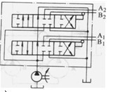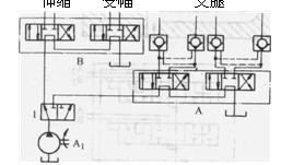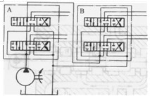 圖1. 3-7為串聯(lián)一獨(dú)聯(lián)系統(tǒng)。多路閥A控制的執(zhí)行機(jī)構(gòu)互相串聯(lián),多路閥B控制的執(zhí)行機(jī)構(gòu)也互相串聯(lián),這兩個(gè)串聯(lián)系統(tǒng)之間則由閥1使它們相獨(dú)聯(lián)。這樣在B閥操縱的執(zhí)行機(jī)構(gòu)動(dòng)作時(shí),不致因誤操作A閥而引起A閥控制的執(zhí)行機(jī)構(gòu)誤動(dòng)作導(dǎo)致事故。