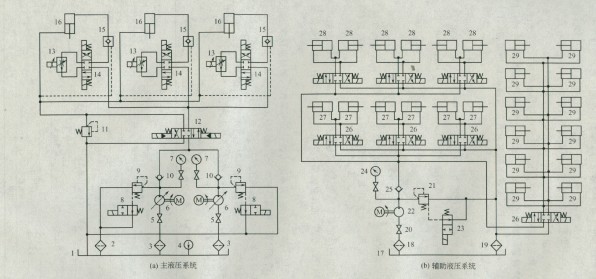 圖3-10 (a)所示為主液壓系統(tǒng),它由兩個(gè)單向變量液壓泵6供油,雙泵的壓力和卸荷分別由兩只溢流閥8和二位二通電磁換向閥9控制,系統(tǒng)壓力可通過壓力表及其開關(guān)7顯示,兩個(gè)單向閥10用于保護(hù)各泵;系統(tǒng)的執(zhí)行器為三位四通電液主換向閥12控制的三個(gè)并聯(lián)主液壓缸1 6,三個(gè)主缸的無桿腔油路上設(shè)置的液控單向閥1 5可在施工中任意位置長時(shí)間鎖定液壓缸,確保系統(tǒng)及設(shè)備的安全。電液比例流量閥13及三位四通電磁換向閥14用來實(shí)現(xiàn)缸的雙向速度控制,三個(gè)電液比例流量閥借助自整角機(jī)構(gòu)成電液閉環(huán)控制系統(tǒng),通過微機(jī)及PID調(diào)節(jié),以滿足三個(gè)液壓缸的同步運(yùn)動(dòng)精度要求;主液壓缸有桿腔油路中并聯(lián)的低壓溢流閥11,用于來實(shí)現(xiàn)縮缸時(shí)有桿腔油液的低壓溢流,以減少發(fā)熱和節(jié)能。