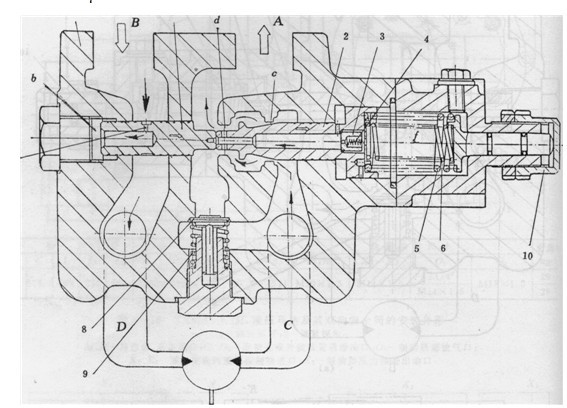 1-先導(dǎo)滑閥;2-主滑閥;3-節(jié)流孔板;4、5、6、9-彈簧,7-閥體;8-單向閥,10-調(diào)壓螺蓋